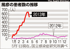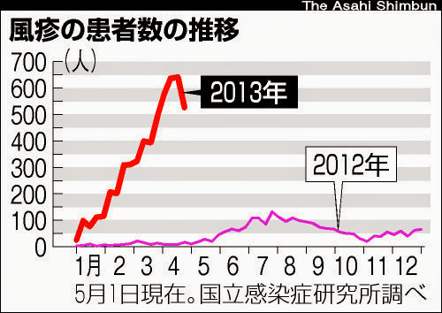 WHO=世界保健機関が発表した、去年の世界各国の風疹の患者数で、日本は、中国やルーマニア、バングラデシュに次いで世界で4番目に患者が多く、先進国で唯一、上位に入っていることが分かり、専門家は「流行を止めるためにも、国は対策を急ぐべきだ」と指摘しています(NHKニュース)。今年の感染者は昨年の同時期の32倍となって、だいぶ深刻な状況。風疹の予防接種は年代によってしていない。30代の男性がこれに当たるそう。風疹自身は3日はしかと言われたくらいで、致死的な病気ではないが、妊娠中の女性が感染すると、生まれてくる赤ちゃんが高頻度で先天性風疹症候群(心奇形、難聴、白内障、脳性麻痺)になる。その確率は高く、90%。風疹予防接種を受けていないか、風疹にかかったことがない妊娠している女性のお腹の赤ちゃんを守るには、今の流行を下げるために男性の予防接種が大事とのこと。それにしても、世界4位の感染率というのは、無菌大国日本で考えられないような本当の話。