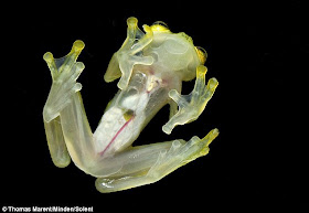 突然変異ではなくて、種として透明な蛙というのがいる。コロンビアにいるガラスガエルは、心臓、内蔵、血管も見える。擬態で体色を変えることができる蛙は多い。例えば、アマガエルも周りの色で体色を変化できる。体色が透明であれば、背景がどんなものでも対応できる究極の擬態なのかもしれない。