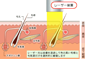 脱毛に用いられるレーザーの波長は700 nmから1000 nmくらいで、皮膚内まで透過しやすい長波長が用いられているようだが、どの波長でも黒髪は破壊できるが金髪は透過するので脱毛には向かないでしょう。レーザーを皮膚に当ててもだいじょうぶで、皮膚は金髪と同じで透過するので、黒い毛だけが破壊される。気をつけないといけないのは、ほくろやしみのような所に当てるとそこも破壊(やけど)することになる。ほくろの破壊ならありがたいと思うかもしれないが、ひとつ間違うとほくろの細胞を活性化して癌化するかもしれないのが怖い。
